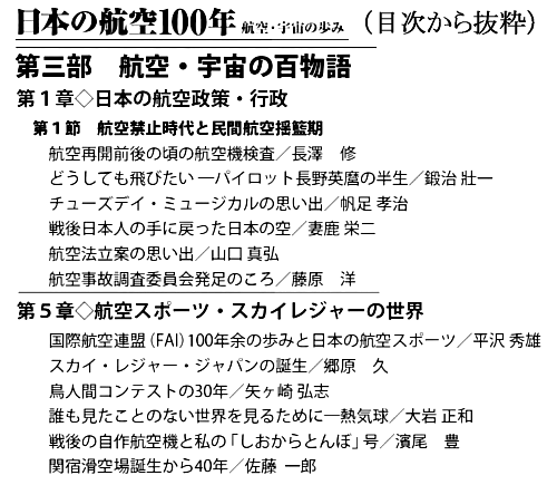 | 60 | EXAL NEWS | 財団法人 日本航空協会から 「日本の航空100年 航空・宇宙の歩み」が出版されました。 当EXALの濱尾会長と藤原理事も執筆に携わっております。次は目次からの抜粋です。 |